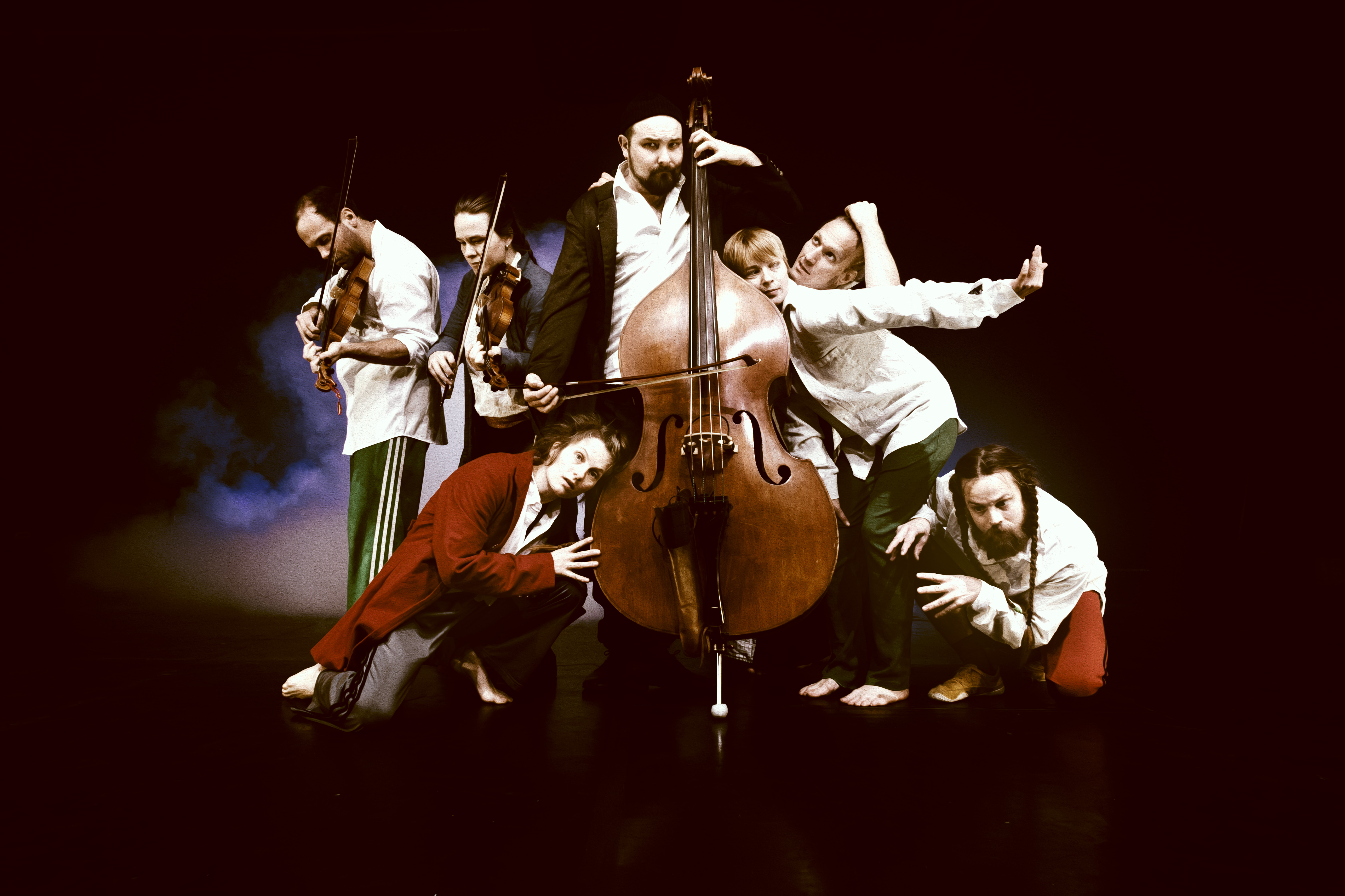Åtte artister fyller scenen med fioliner, kontrabass, sang, synth, akrobatikk, trapes, tau og hårhenging. Sammen skaper de et energisk konsertsirkus der musikk og kropp driver hverandre fram, og der tradisjonelle danseformer utfordres av nye bevegelser.